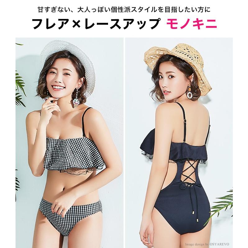 水着 レディース モノキニ セクシー 体型カバー ワンピース バックシャン チェック 黒 ブラック 無地 フリル フレア バンドゥ レースアップ水着 Sq9003 夢line 通販 Yahoo ショッピング