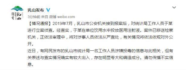 公务员在同事饮水中投放母猪 性激素 官方回应了 来源 深蓝财经综合自潇湘晨报 乳山发布 红星新闻近日 网传山东乳山市统计局一名在职公务员因对干部任用不满意 网购刺激